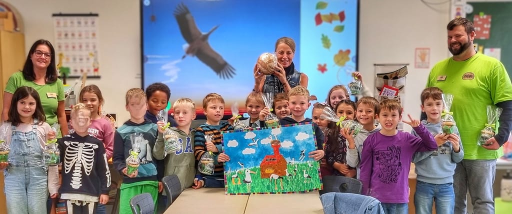 Die Familie Hörhammer zeigte sich begeistert und rief spontan eine Sonderkategorie für Gemeinschaftsbilder ins Leben, um die kreative Teamleistung der Kinder zu würdigen. Die Freude war riesig, als die Nachricht kam, dass ihr Bild als Sieger dieser Kategorie ausgezeichnet werden sollte. Die Preisverleihung fand am 10. Oktober 2025 direkt im Klassensaal statt. Angela und Michael Hörhammer, die die traditionsreiche Bäckerei als Inhaber führen, ließen es sich nicht nehmen persönlich vorbeizuschauen. In einer feierlichen und zugleich gemütlichen Runde erfuhren die Kinder viel über das Bäckerhandwerk: über frühe Arbeitszeiten, den Duft frischen Brots in den Morgenstunden und die Sorgfalt, mit der täglich gebacken wird. Besonders spannend waren die Erzählungen über das Storchendorf Lohnsfeld, über die eindrucksvollen Vögel, ihre Nistgewohnheiten, die langen Reisen in den Süden – und darüber, dass einige ältere „Herrschaften“ inzwischen sogar das ganze Jahr überbleiben. Das Leben mit den Störchen, so erfuhren die Kinder, gehört im Dorf ganz selbstverständlich zum Alltag.