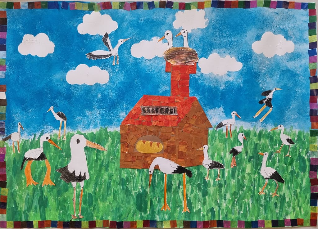 So entstand die Idee, ihre einzeln gemalten Störche auszuschneiden und zu einem großen Gemeinschaftsbild zusammenzufügen – eine lebendige Storchenlandschaft, in der sich die Vögel auf einer grünen Wiese vor blauem Himmel rund um ein kleines Bäckereigebäude tummeln.